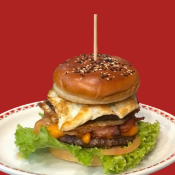 Pão, 2 hamburguer de carne, 2 ovos, bacon, alface, tomate, catupiry e cheddar