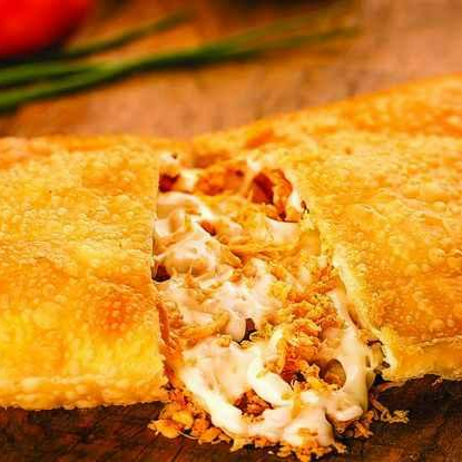 pastel recheado de frango desfiado e temperado e catupiry cremoso