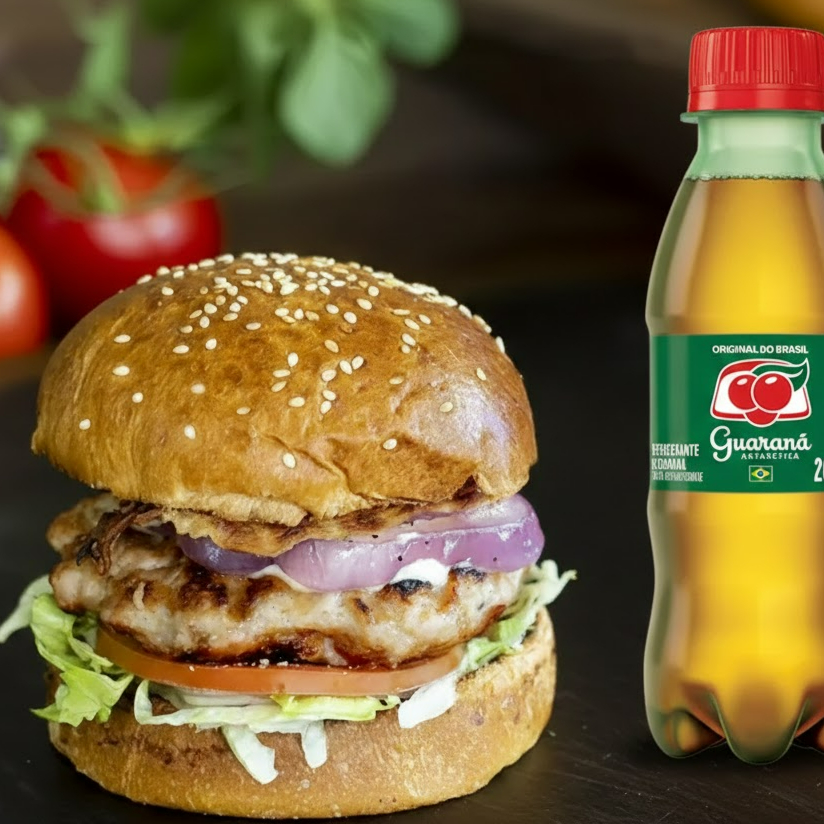 Combo Com Pão Brioche, Hamburguer, Cebola, Alface, Tomate, Frango e Molho da Casa e um guaraná 200ml grátis.
