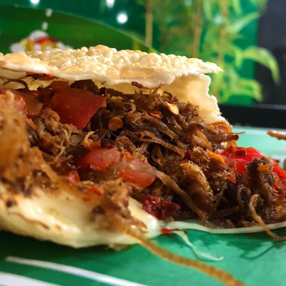 Pastel de Carne de Sol com pimenta calabresa, queijo, tomate e orégano.