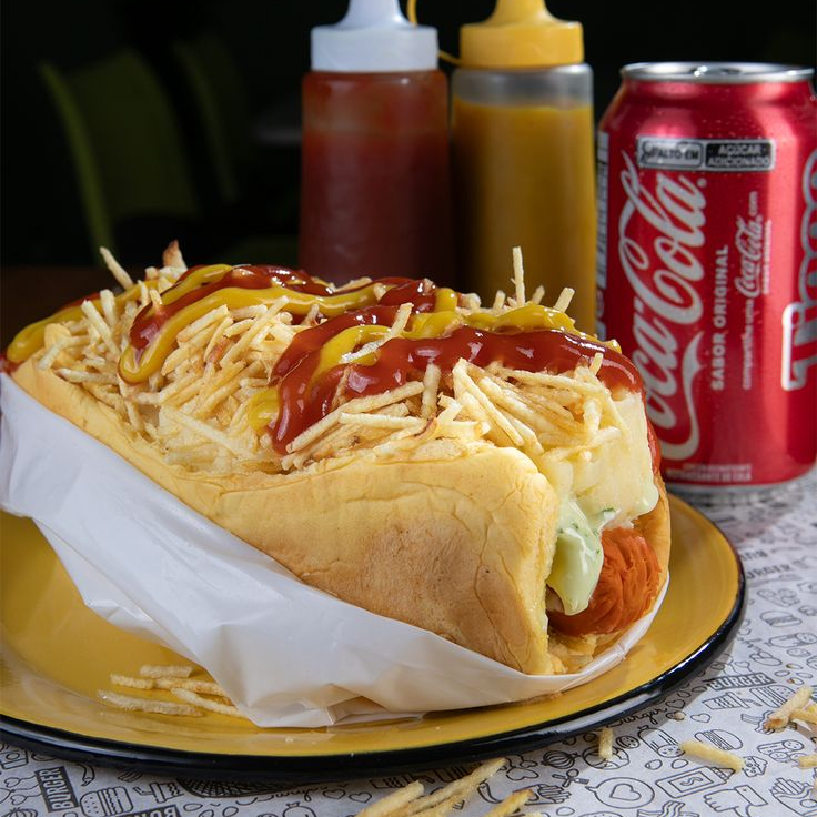 Venha saborear nosso super HOTDOG com molho tradicional de salsicha+milho+mussarela+batata palha . Uma explosão de sabor!