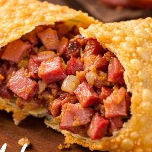Delicioso pastel recheado com calabresa suculenta e mussarela derretida, proporcionando uma experiência saborosa e marcante.