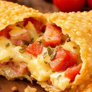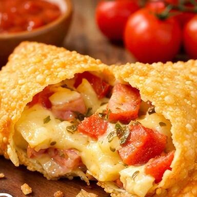 Desfrute do pastel de pizza, recheado com mussarela, presunto, tomate fresco e orégano, trazendo o sabor autêntico da pizza em cada mordida.