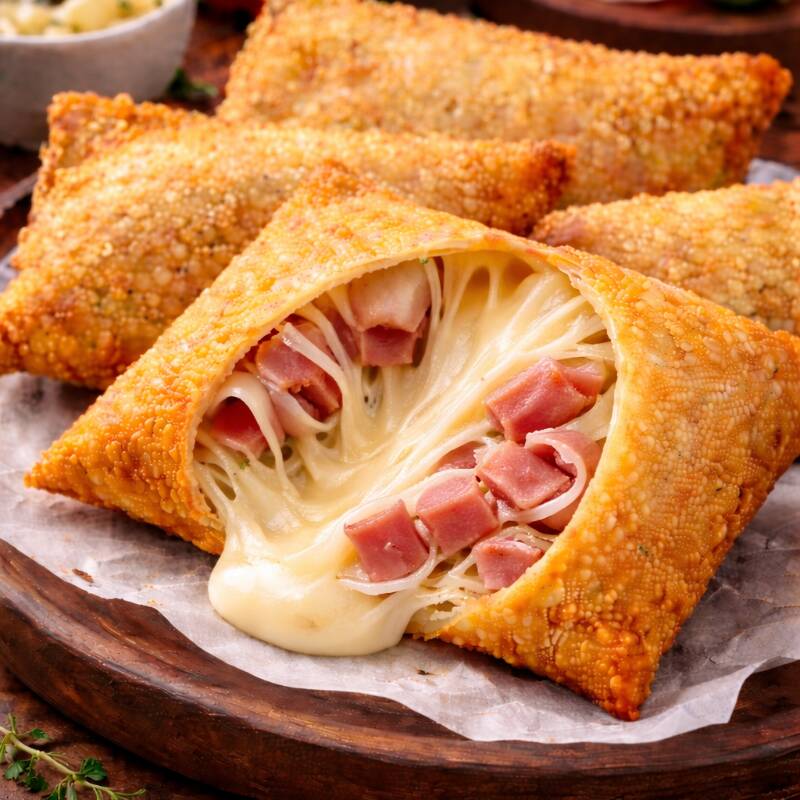 Pastel de Queijo com Presunto Presunto saboroso com queijo derretido dentro de uma massa crocante feita na hora.