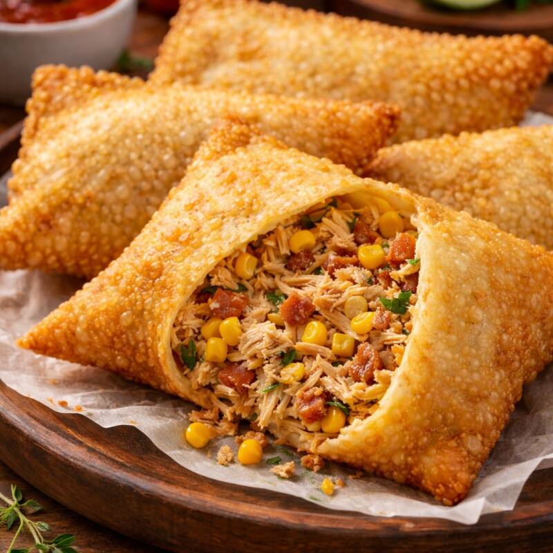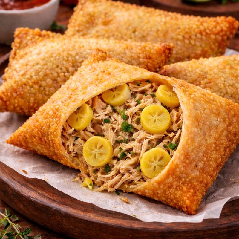 Pastel de Frango com Milho Massa crocante recheada com frango desfiado bem temperado e milho, combinação deliciosa e equilibrada.