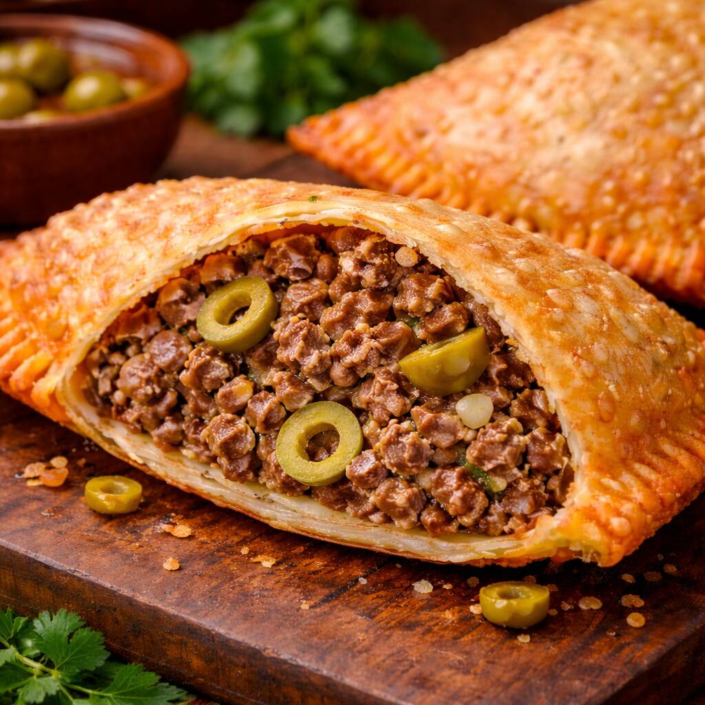 Pastel de Carne com Azeitona Massa crocante recheada com carne moída bem temperada e azeitonas, trazendo um sabor especial.