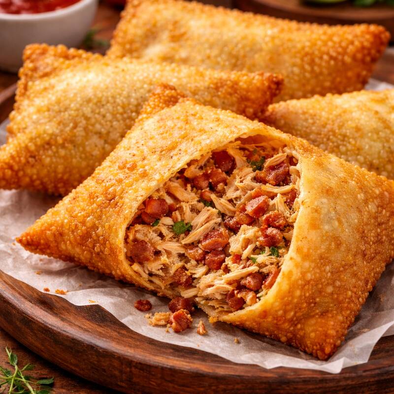 Pastel de Frango com Bacon Massa crocante recheada com frango desfiado bem temperado e bacon crocante, combinação cheia de sabor.