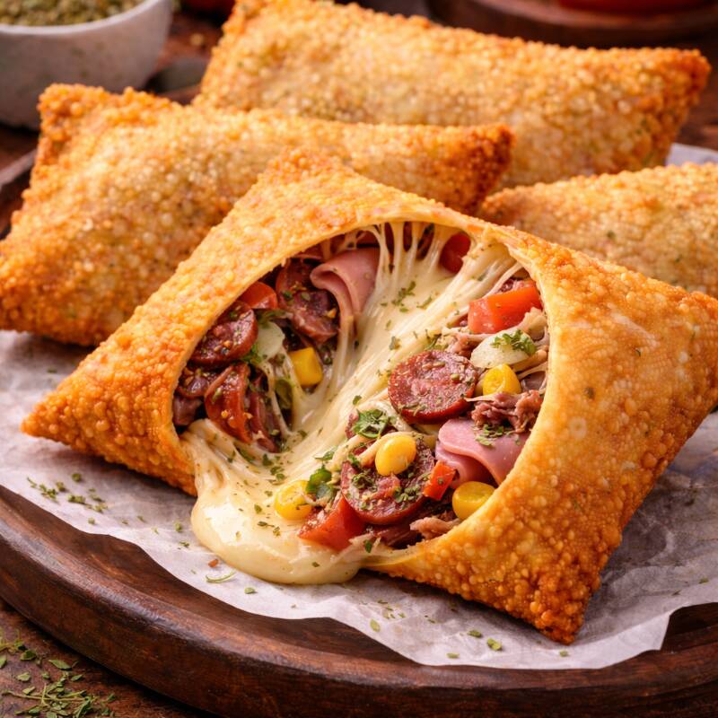 Pastel de Pizza Massa crocante recheada com presunto, queijo, calabresa, tomate, molho e orégano, trazendo o sabor clássico da pizza em forma de pastel.