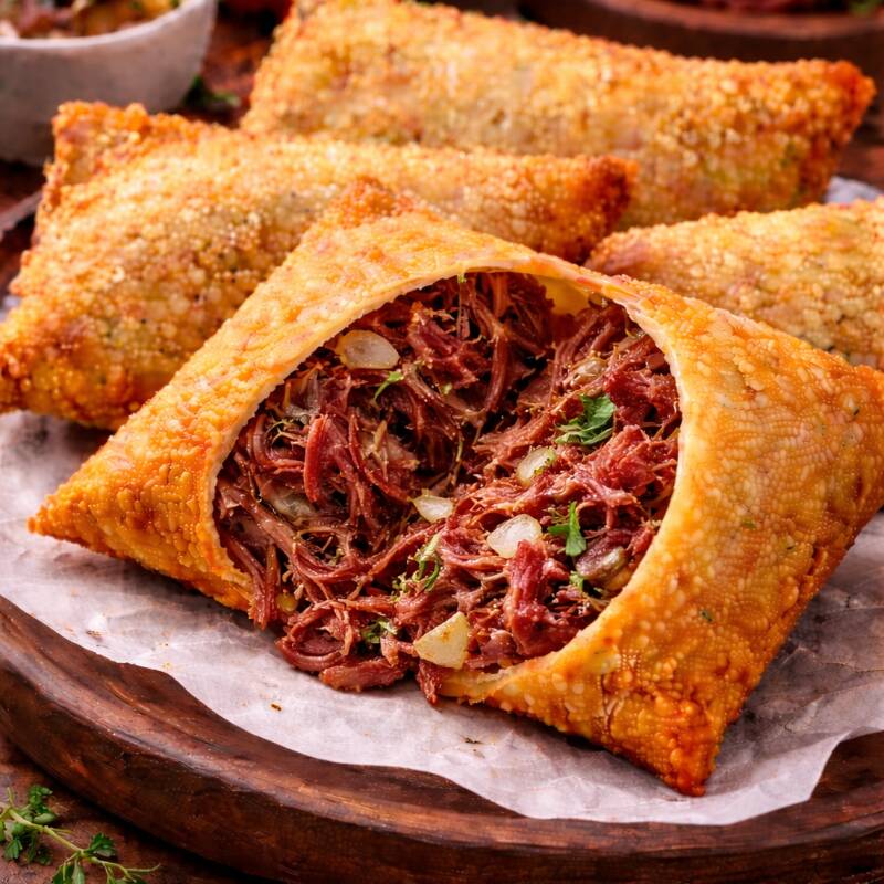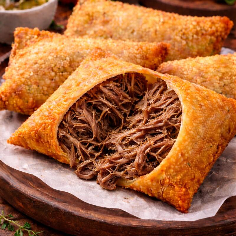 Pastel de Carne Seca com Queijo Massa crocante recheada com carne seca desfiada bem temperada e queijo derretido. Sabor irresistível!