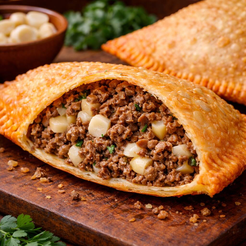 Pastel de Carne com Catupiry Massa crocante recheada com carne moída bem temperada e catupiry cremoso. Uma combinação deliciosa!