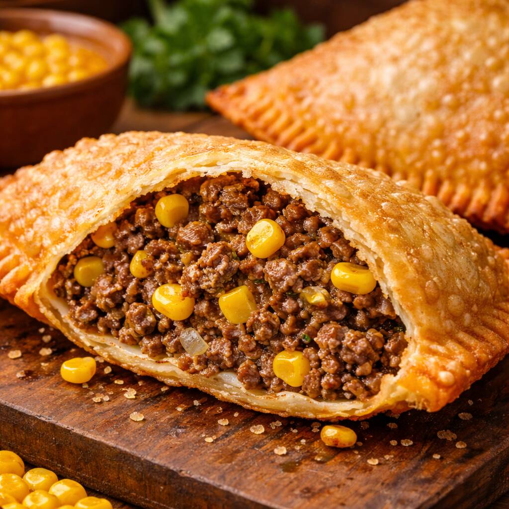 Pastel de Carne com Milho Massa crocante recheada com carne moída bem temperada e milho doce, combinação deliciosa e cheia de sabor.
