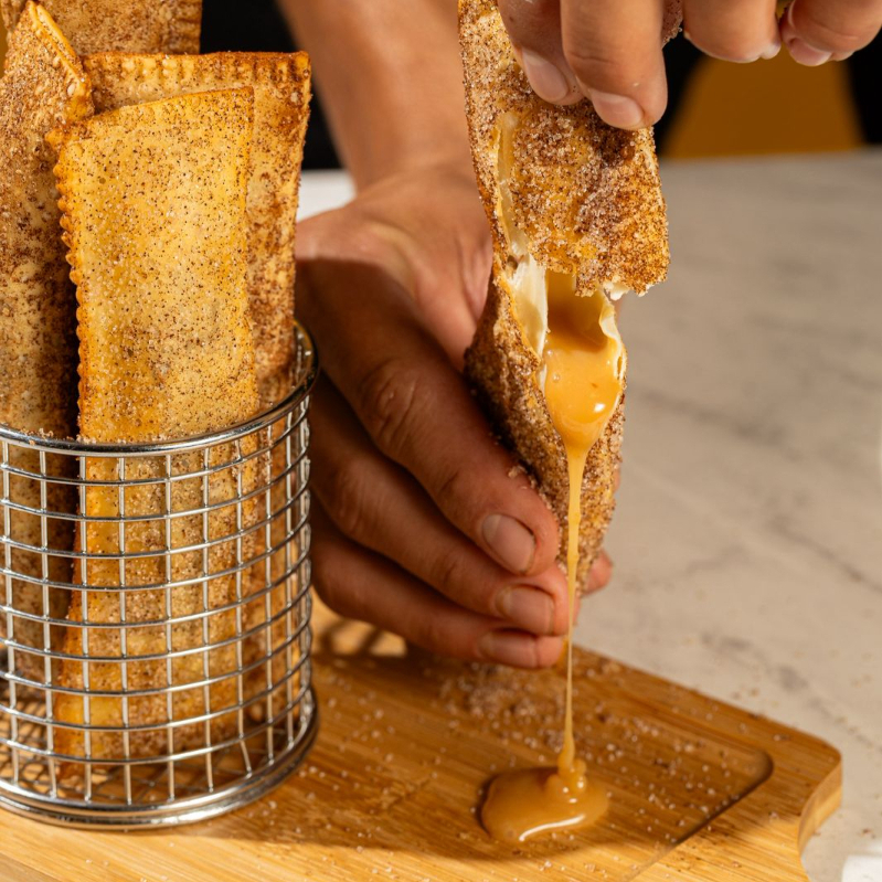 Deliciosos sticks feitos com massa tradicional, com um verdadeiro doce de leite de recheio e envolto no açúcar e canela