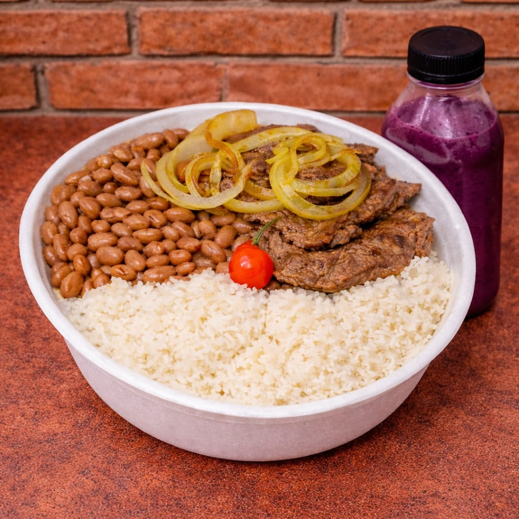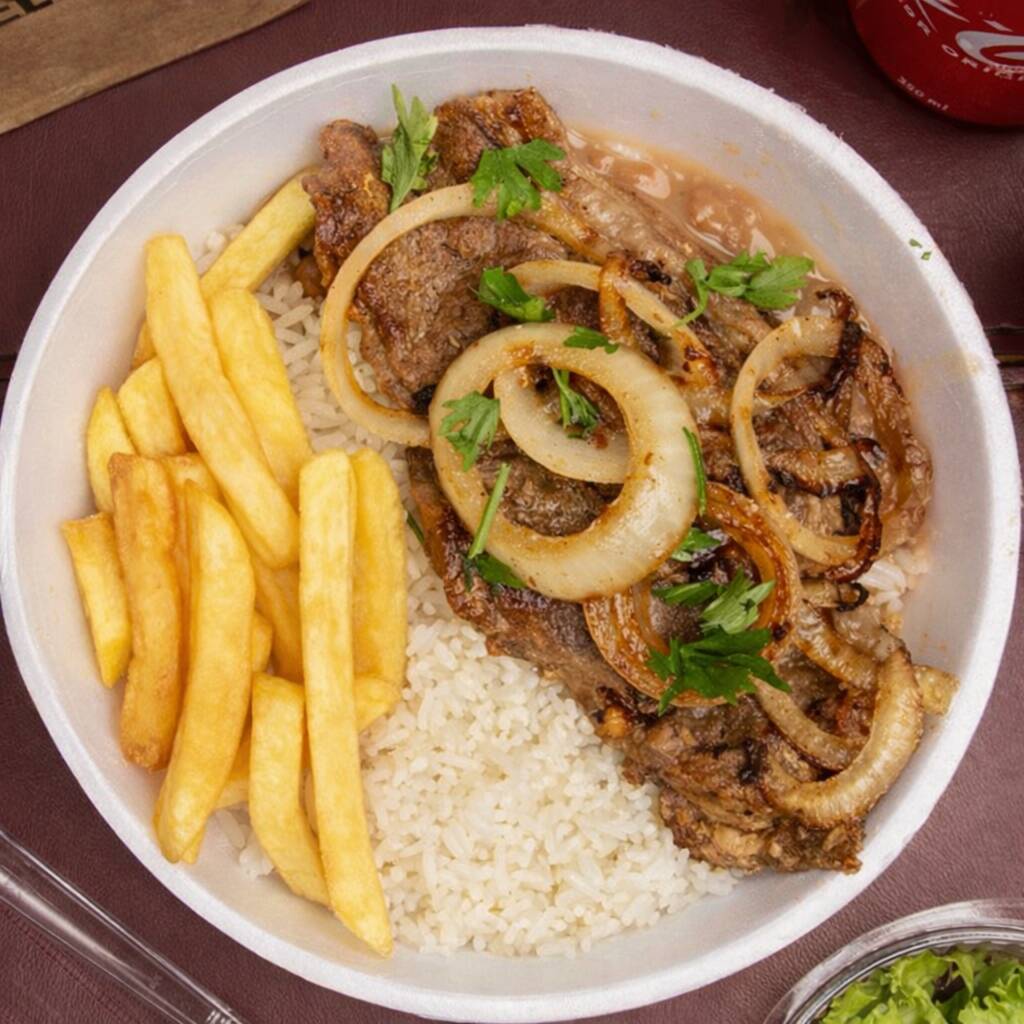 escolha o tamanho da sua Marmita com delicioso Bife Acebolado macio e suculento, acompanhado de arroz branco, feijão de caldo, e batatas fritas, (Marmita Indicada Para 01 Pessoa)