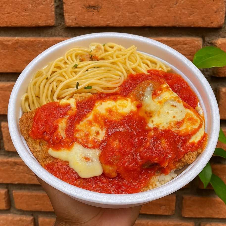 Marmita com Delicioso filé de Frango á parmegiana (empanado na massa crocante, coberto com molho de tomates e queijo mussarela) acompanhado de macarrão espaguete suculento al dente. (Marmita Indicada Para 01 Pessoa)