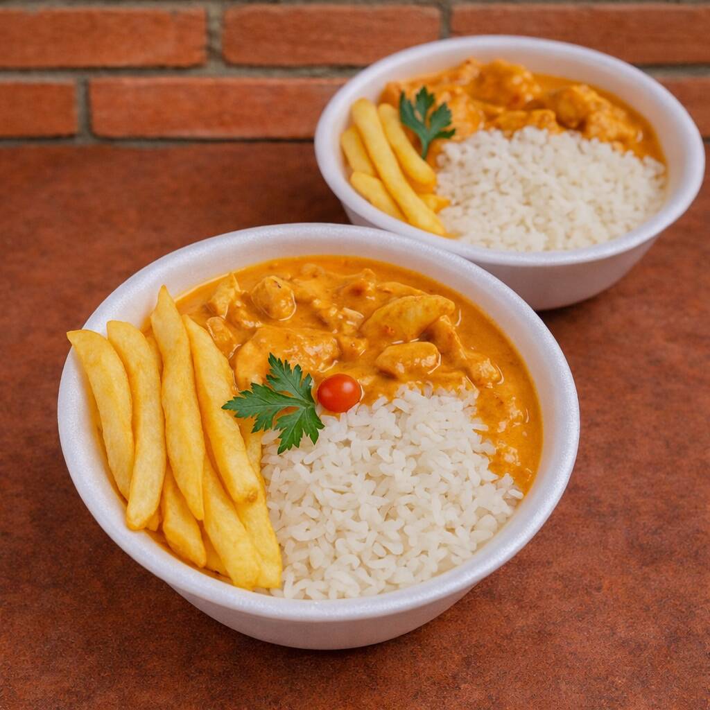 Marmita com delicioso filé de frango ao molho estrogonofe acompanhado de arroz branco e batata palha. (Marmita Indicada Para 01 Pessoa)