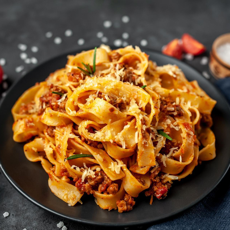 Ao molho bolonhesa feito na casa com tomates frescos.