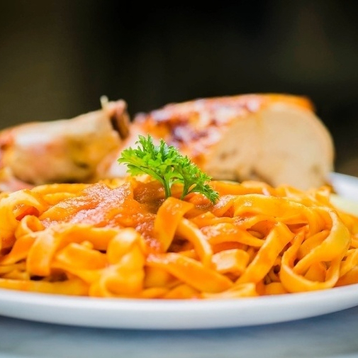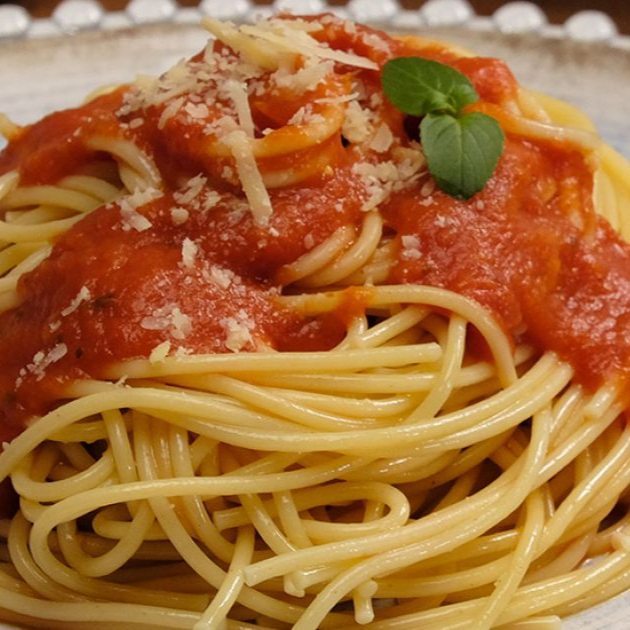 Massa longa com molho de tomate rústico, manjericão e alho.