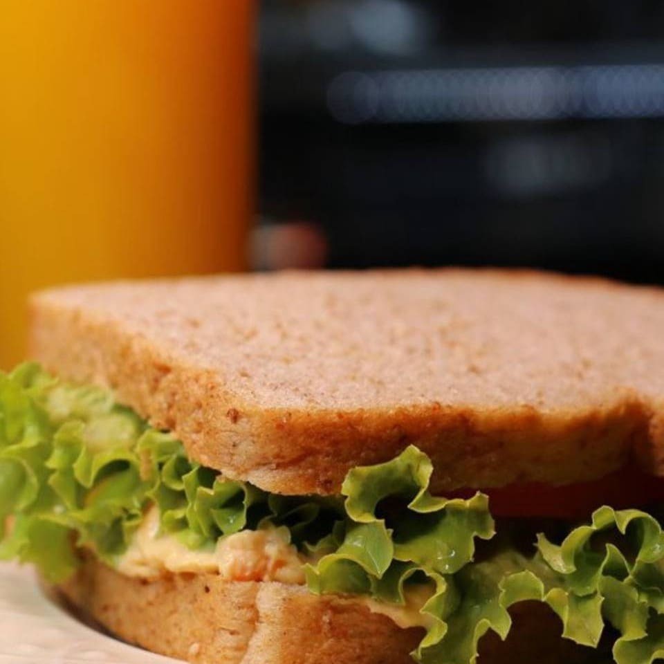 Sanduiche Natural: Pão de forma integral, patê de frango com cenoura, presunto e mussarela, alface e tomate. + Suco de laranja natural da fruta.
