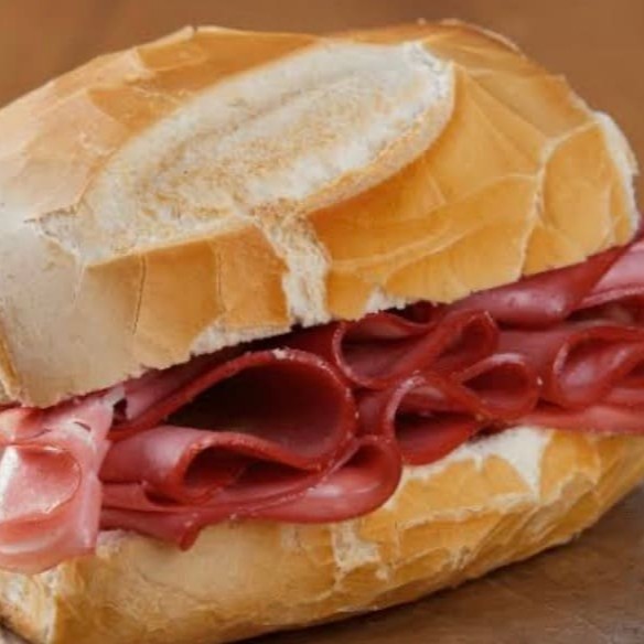 Sanduiche Pertutti: Pão, hambúrguer, presunto, mussarela, salsicha, bacon, alface e tomate.