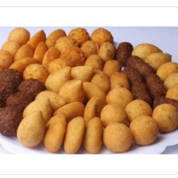 Coxinha, quibe, risole de carne, risole de milho, risole de presunto e queijo, bolinha de queijo entre outros.