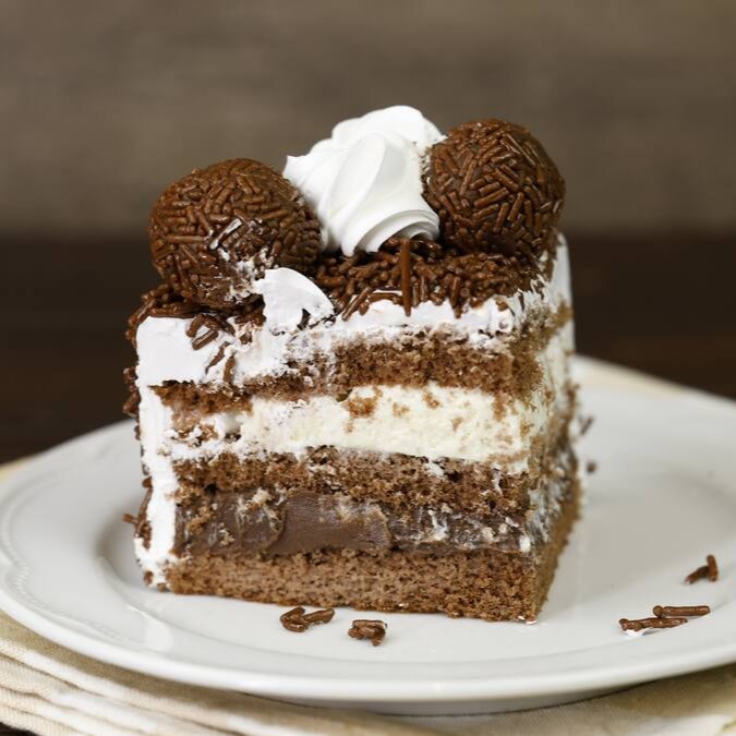 Pão de ló de chocolate, brigadeiro preto, cobertura chocolate granulado.