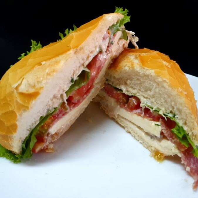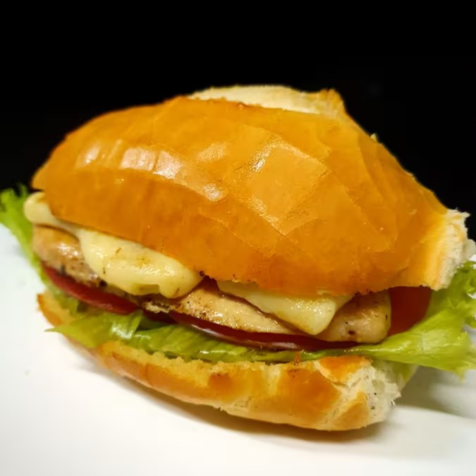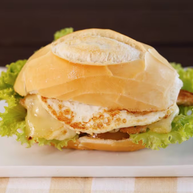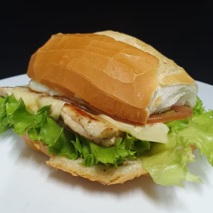 Pão Francês, filé de frango, queijo, bacon, ovo, alface e tomate