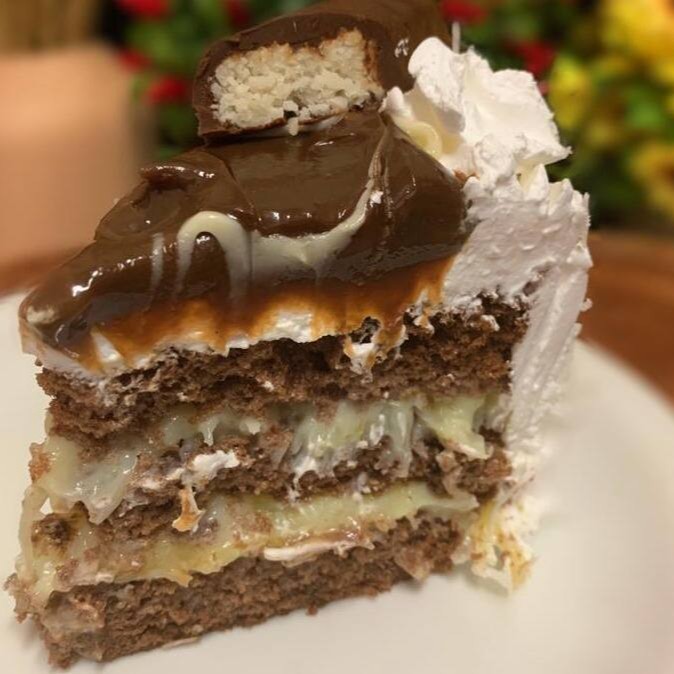 Pão de ló de chocolate, creme Prestígio, cobertura de ganache com chantily e coco ralado.