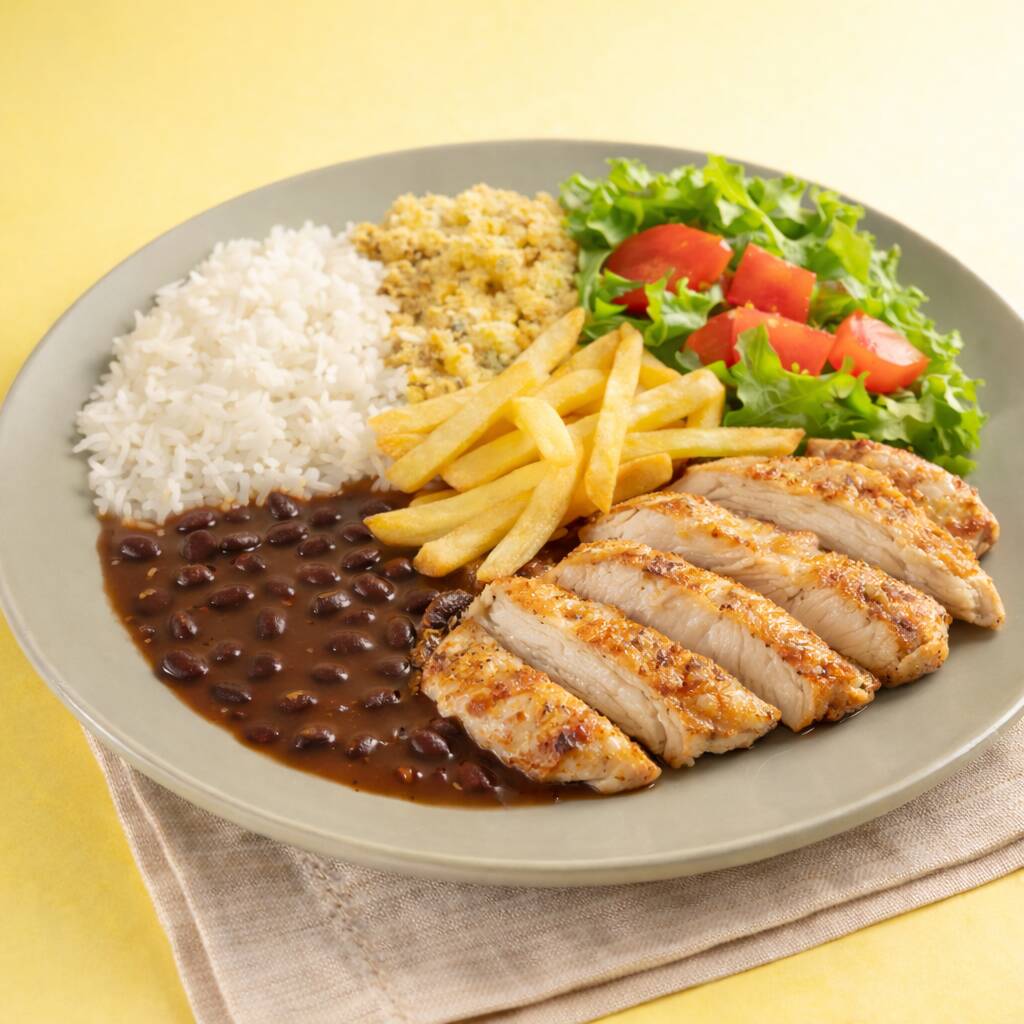 Marmita Acompanha: Arroz, feijão de caldo, farofa, batata frita, salada de alface e tomate, bife de frango acebolado