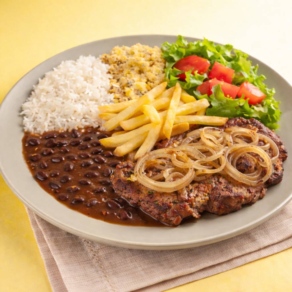 Marmita acompanha: Arroz, feijão de caldo, farofa, batata frita, salada de alface e tomate, bife acebolado.