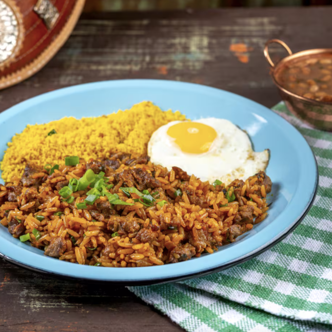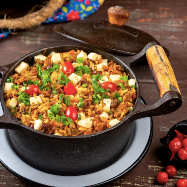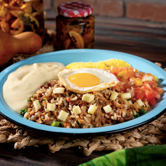 Arroz carne de sol desfiada, queijo coalho, feijão de corda, tomate, pimentão e manteiga do sertão. Acompanha ovo frito, vinagrete, farofa e purê de mandioca.