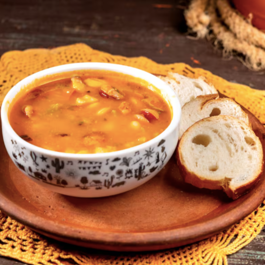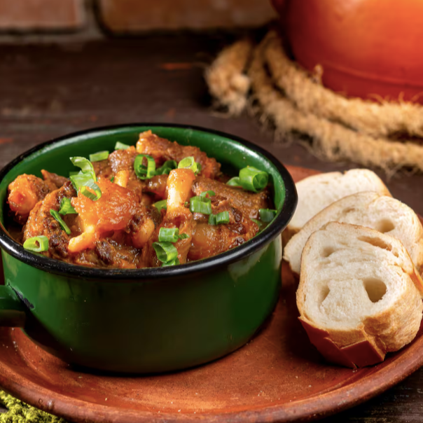 Fava branca cozida com costelinha suína, bacon, linguiça calabresa e legumes. Acompanha pão e cebolinha.