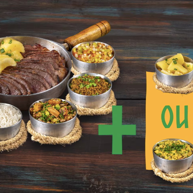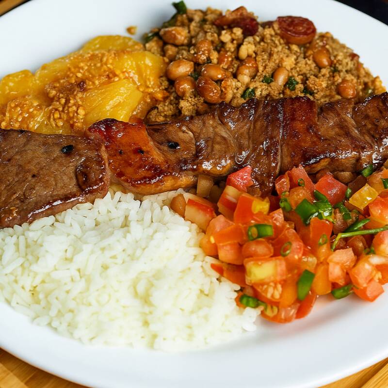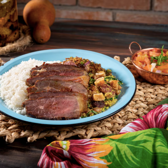 Um prato completo e cheio de sabor: Carne de Sol ao estilo churrasco com arroz branco, feijão tropeiro, mandioca palito crocante, paçoca caseira e vinagrete fresco. Uma combinação que representa o melhor da culinária brasileira!