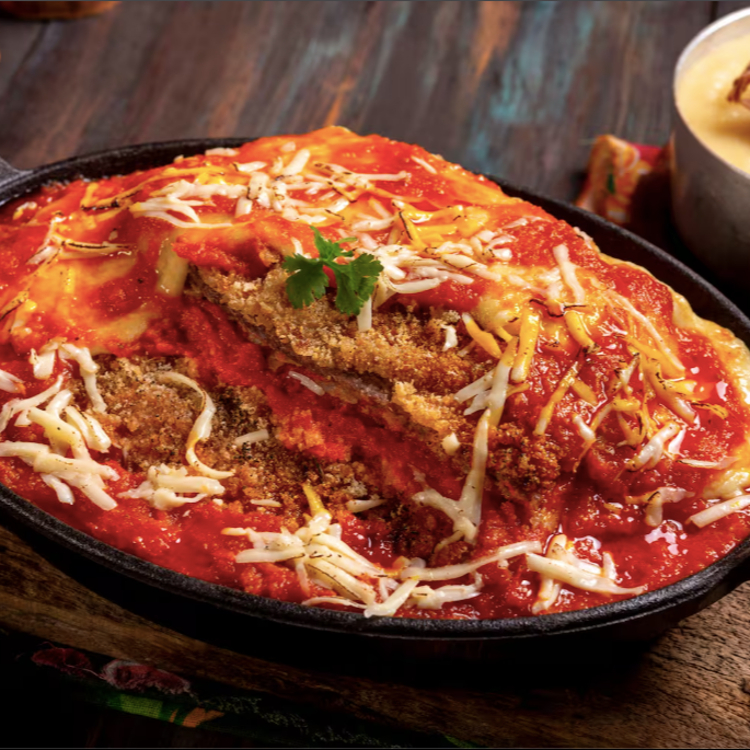 Parmegiana de Carne de Sol: um clássico da gastronomia brasileira elaborado com ingredientes típicos da nossa terrinha boa. Carne de Sol empanada na farinha de Biju, coberta com muçarela e queijo de coalho, servida ao molho de tomate artesanal com especiarias nordestinas e crispy de cebola. Acompanha purê de mandioca da casa com alho assado e requeijão moreno.