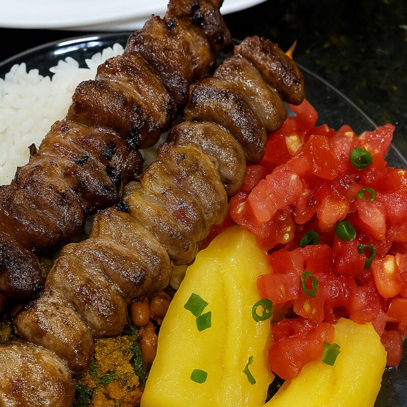 Espetinho de coração acompanhado de mandioca cozida arroz e tropeiro