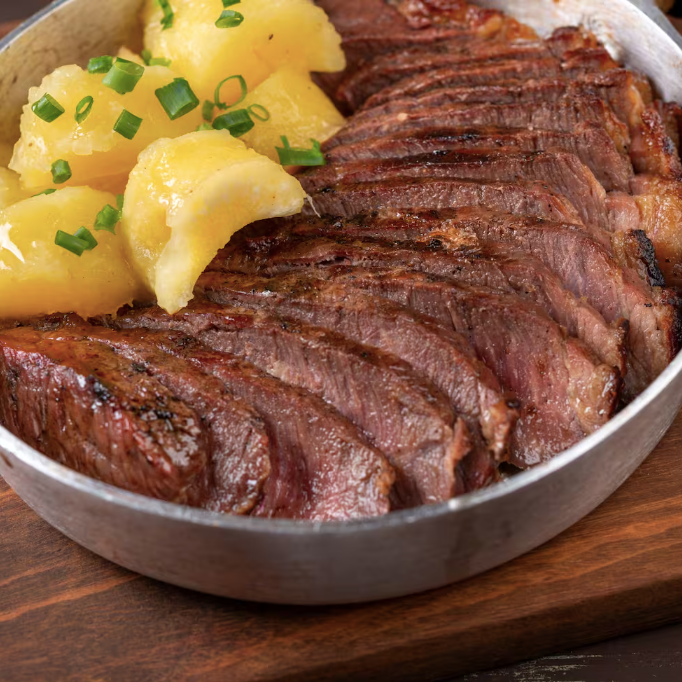 O melhor do churrasco do nordeste feito da carne do gado mais saboroso, o Angus. Corte alto, de cerca de 5cm, selado na brasa. Acompanhado de cuscuz ou mandioca cozida. Arroz, feijão tropeiro, paçoca e vinagrete.