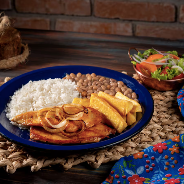 Saboroso Bife de Filé de Frango, preparado ao ponto perfeito, garantindo a suculência e o sabor inconfundível. Acompanhado de um delicioso arroz soltinho, feijão de caldo rico e aromático, que proporciona uma experiência única.