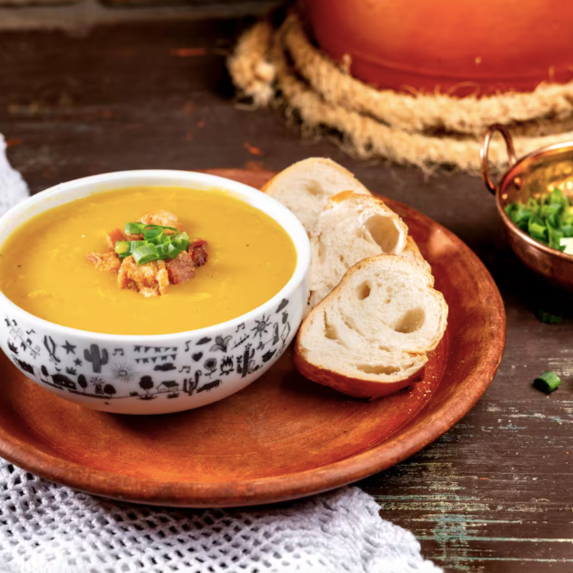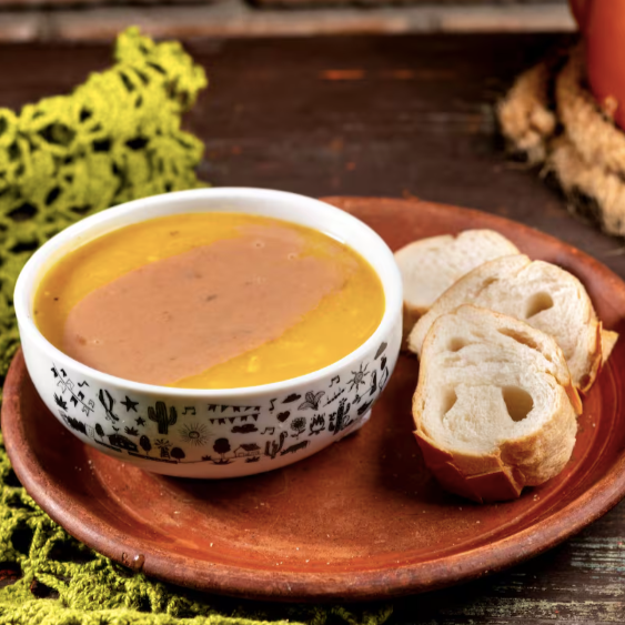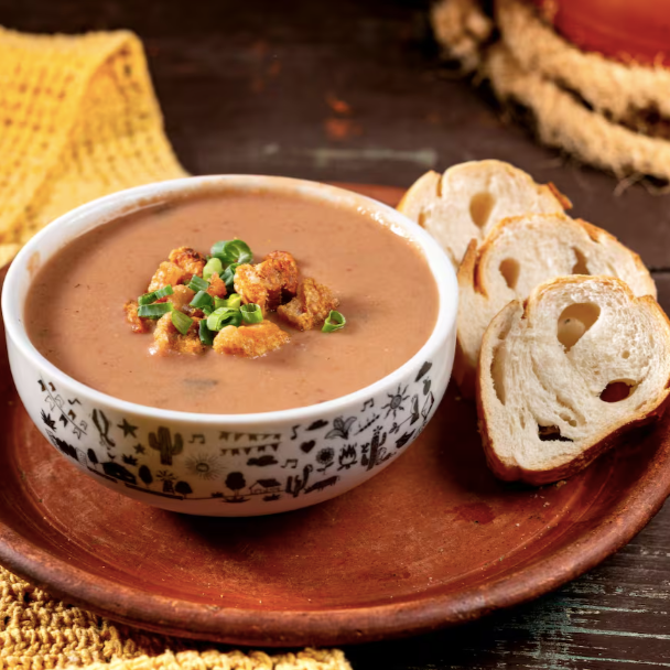 Feijão carioca, bacon, linguiça calabresa, louro, alho e temperos, tudo batidinho e coado. Acompanha pão e cebolinha.