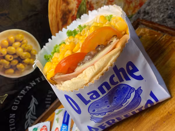 Hambúrguer, Presunto, Mussarela, Bacon, Milho, Batata, Alface, Tomate.
