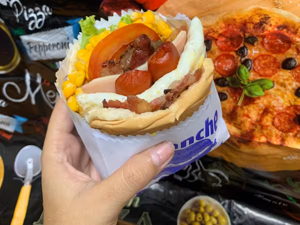 Filé de frango, Presunto, Mussarela, Bacon, Ovo, Salsicha, Milho, Batata, Alface, Tomate.
