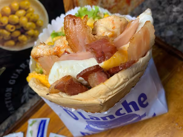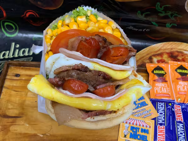 Hambúrguer, Presunto, Mussarela, Bacon, Ovo, Milho, Batata, Alface, Tomate.