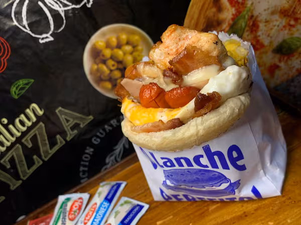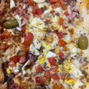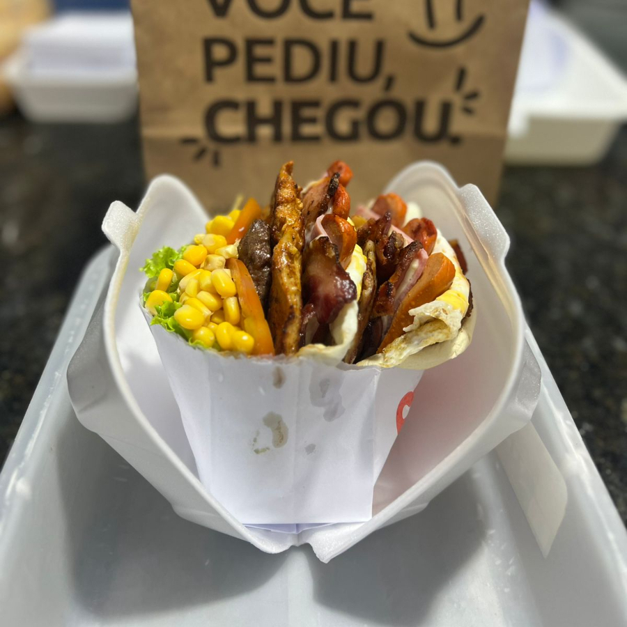 Filé de frango, Presunto, Mussarela, Bacon, Ovo, Milho, Batata, Alface, Tomate.