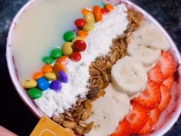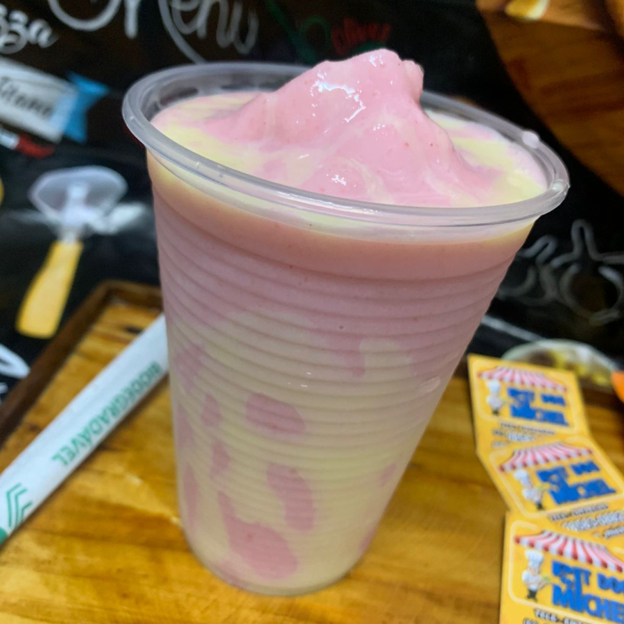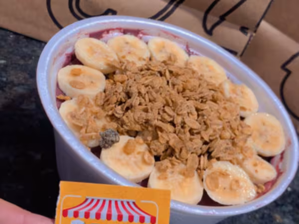 Açai com Leite Condensado, Leite em pó, Banana, Morango, Paçoca e Granola