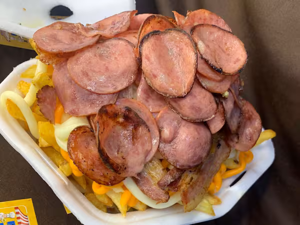 Batata frita com Calabresa, Queijo, Cheddar e Catupiry.