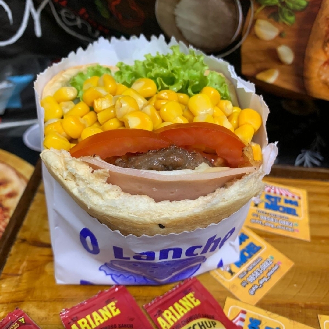 Hambúrguer, Presunto, Mussarela, Milho, Batata, Alface, Tomate.