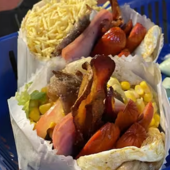 Pão, Hambúrguer, 1 Carne (a escolha), Ovo, Bacon, 2 Salsichas, Presunto, Queijo, Tomate e Alface.
