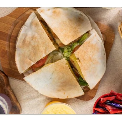 Pão Sírio, 2 Filé de Frango Gg, 4 Queijos, Orégano, azeite e salada.