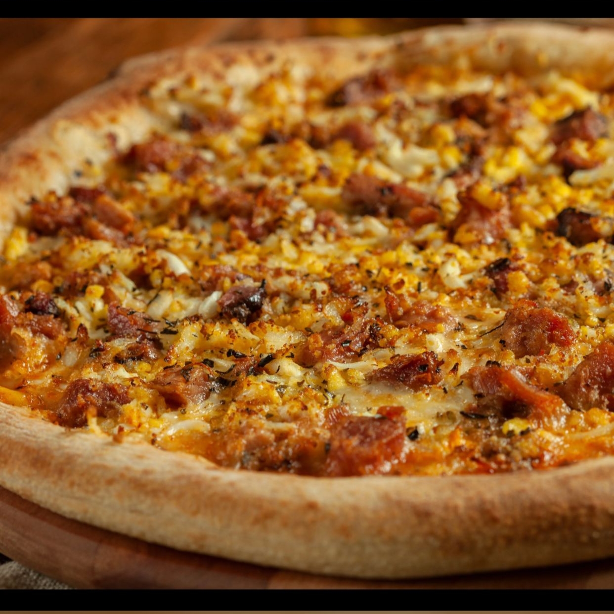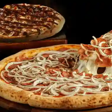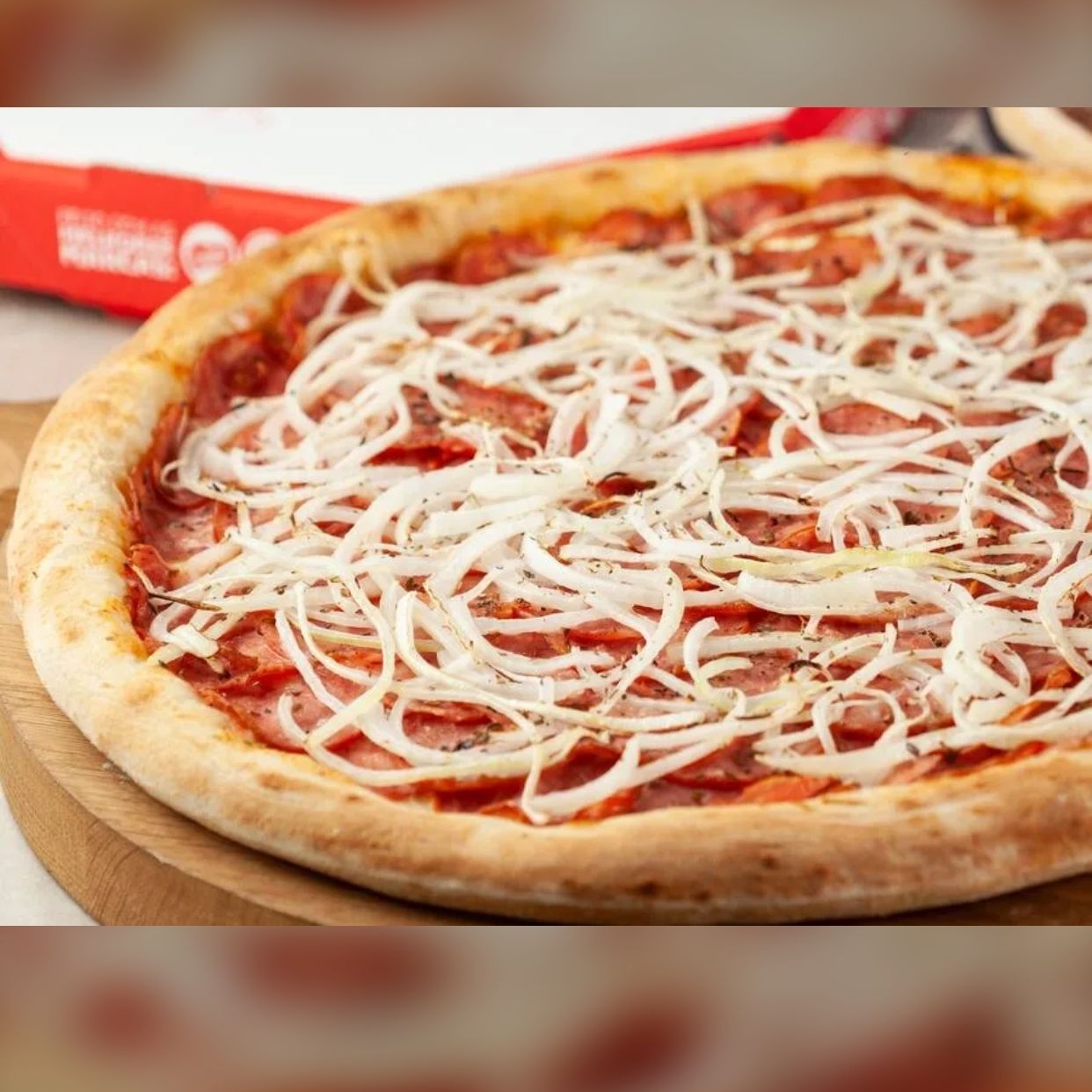 Molho, Calabresa, Ovo, Pimenta, Cebola, Mussarela + Doce Gratis