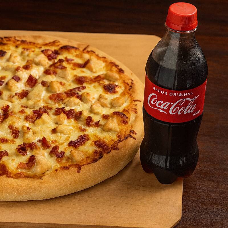 Molho, Frango, Creme Cheese, Mussarela, Bacon, Oregano, + Refri 600 ml Gratis