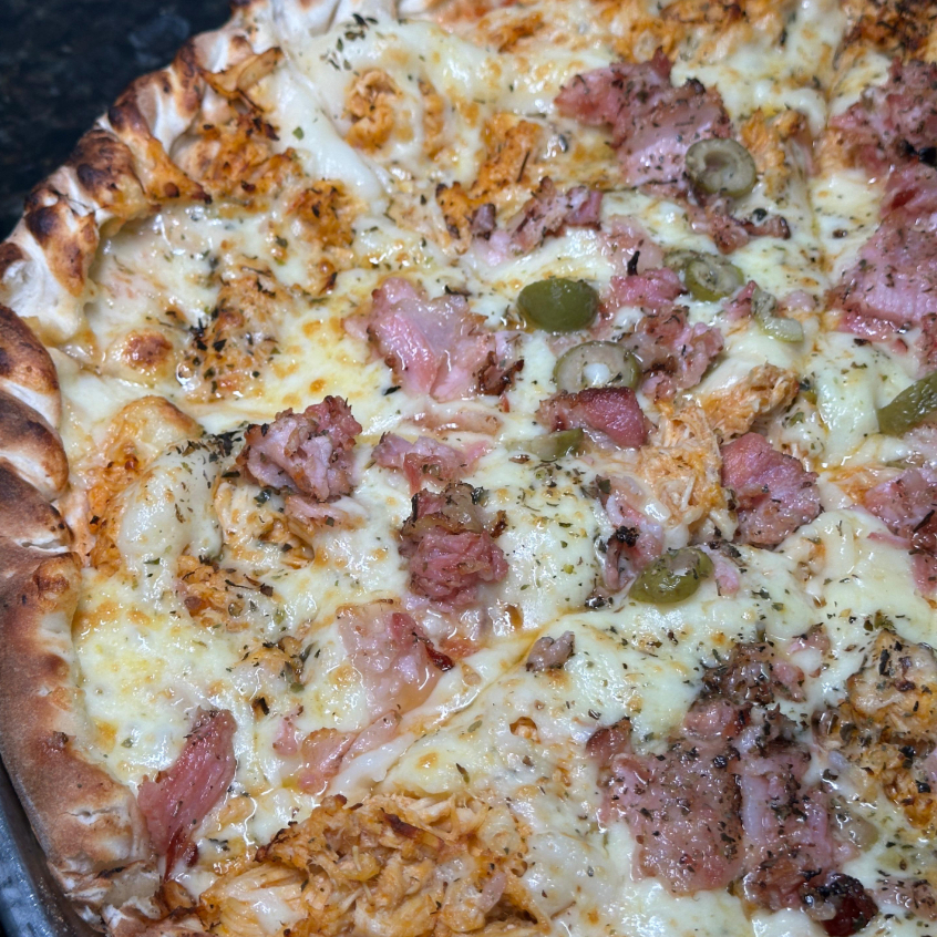 Azeitona, Bacon, Frango Desfiado, Molho Especial, Muçarela, Orégano, Requeijão Tipo Catupiry