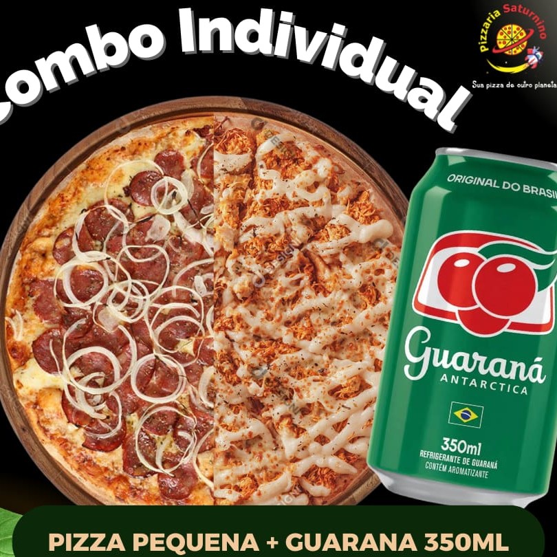 1 Pizza pequena com 4 pedaços (25cm) sendo metade no sabor de Calabresa acebolada e a outra metade no sabor de Muçarela bem cremosa e para acompanhar um Guaraná Antarctica 350ml super gelado esperando você pedir!